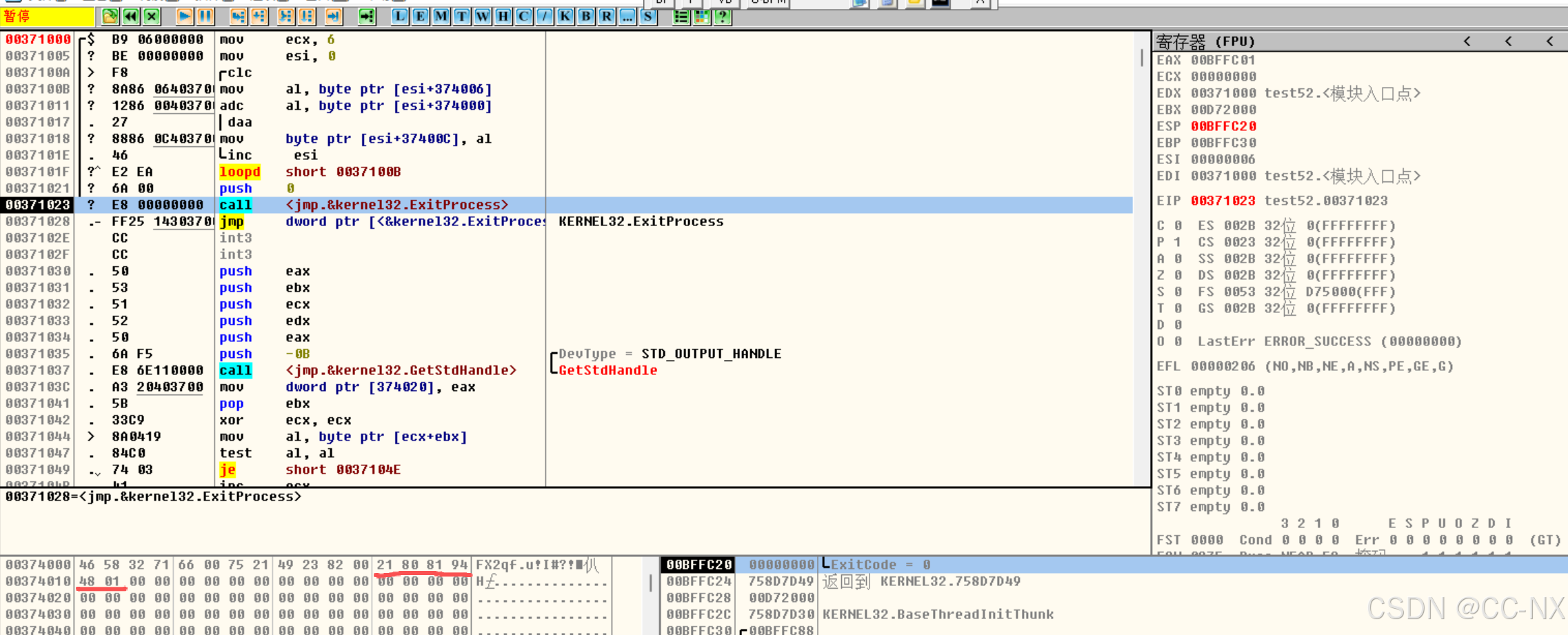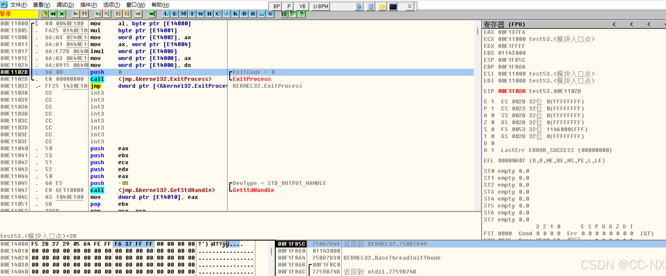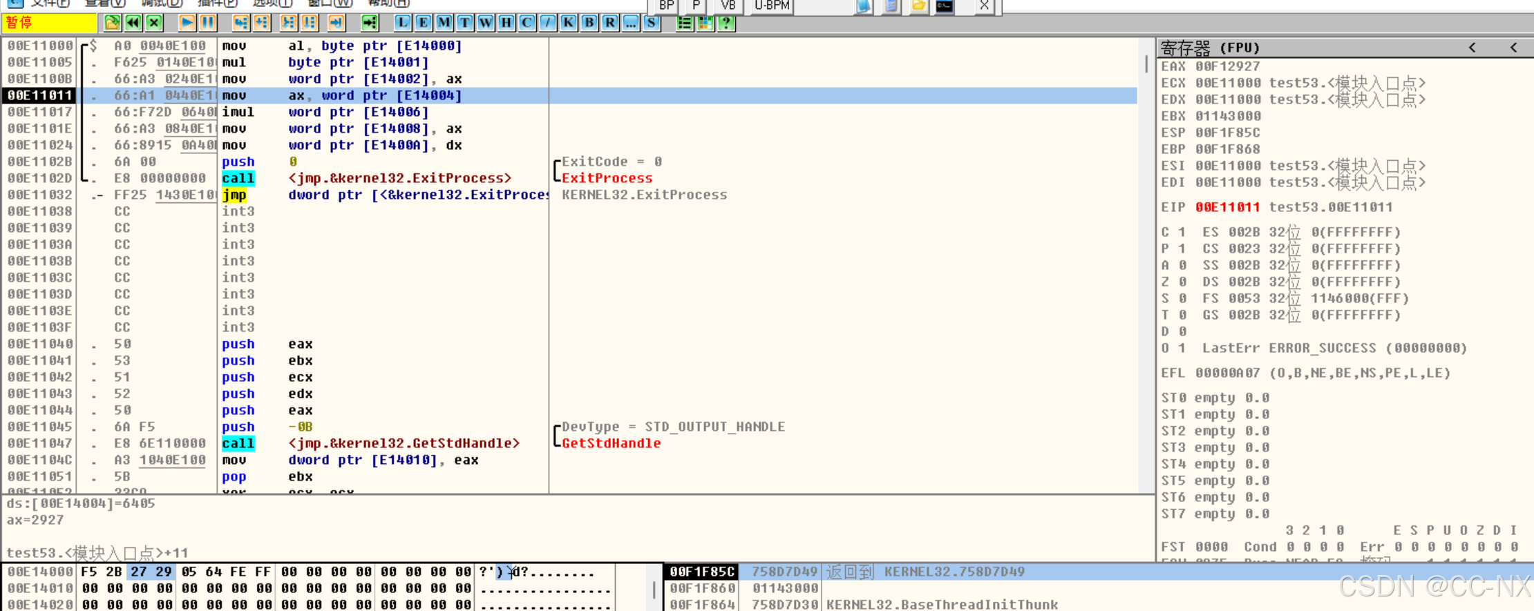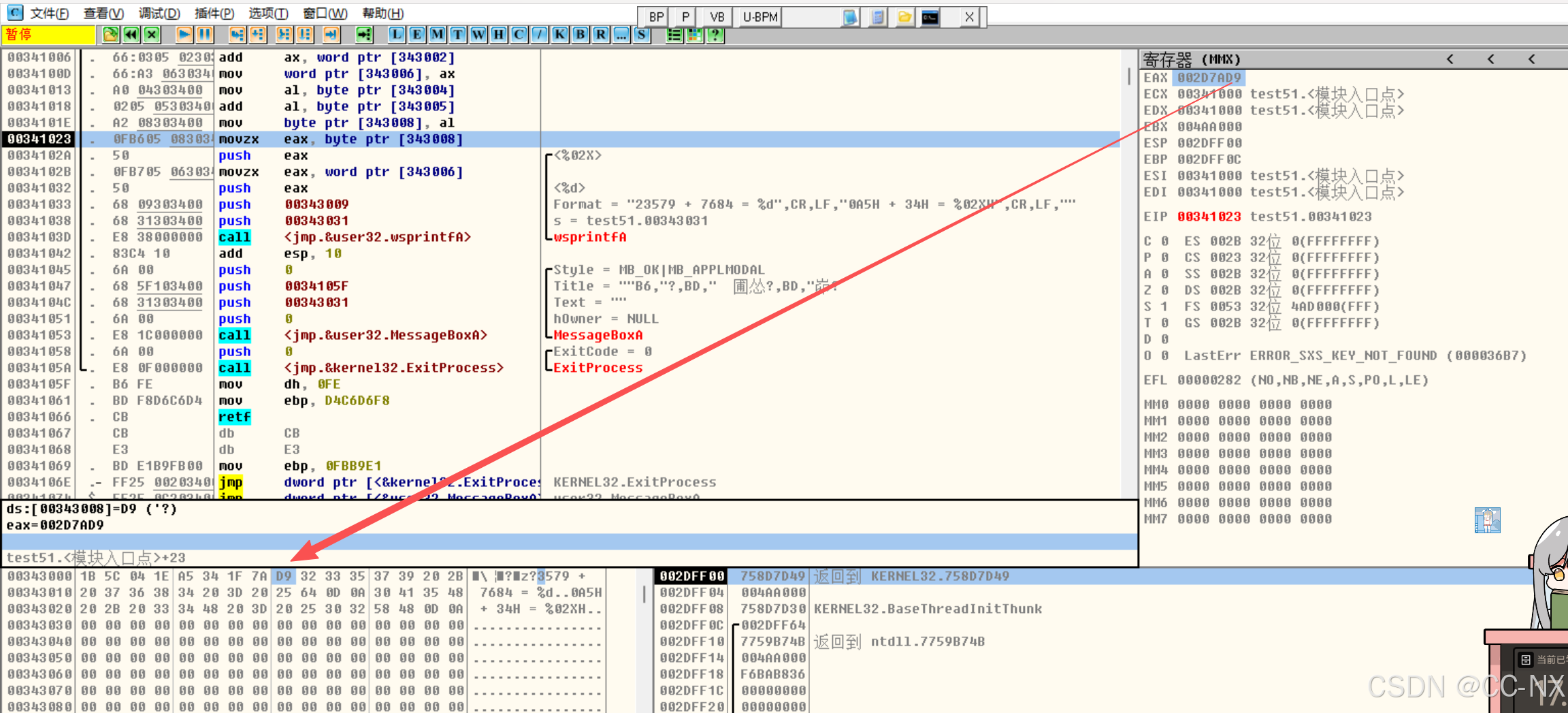 此后循环依次执行,我们发现该代码并没有直接退出循环,问题为ECX≠0,我们只把CX置0,修改后程序正常6此后退出循环,得到我们相加后的数值