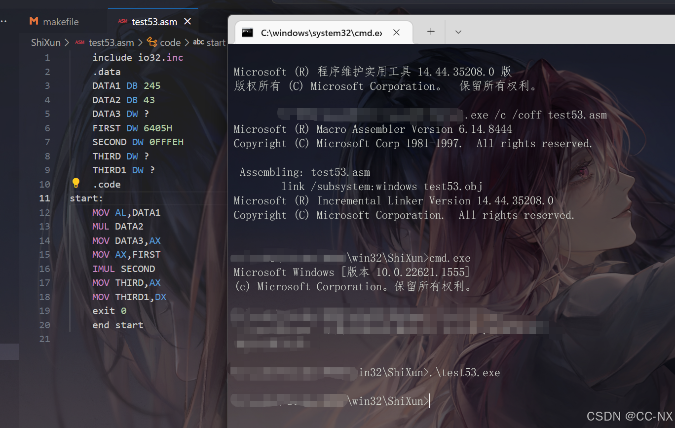 MASM32 内存声明字节用 db,字用 dw,双字用 dd;带符号十进制字面量直接写,如 -12345,MASM 会自动按 16 位补码编码。