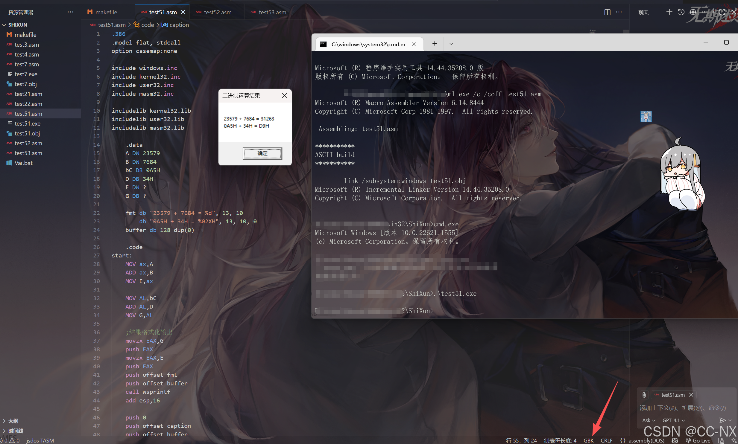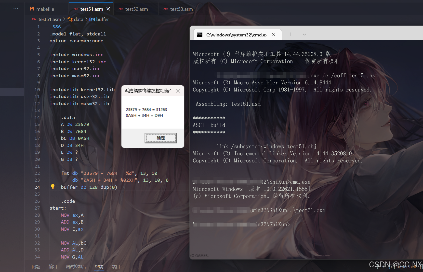 includelib masm32.lib.dataA DW 23579 B DW 7684 bC DB 0A5H D DB 34H E DW ? G DB ? fmt db "23579 + 7684 = %d", 13, 10db "0A5H + 34H = %02XH", 13, 10, 0buffer db 128 dup(0).code