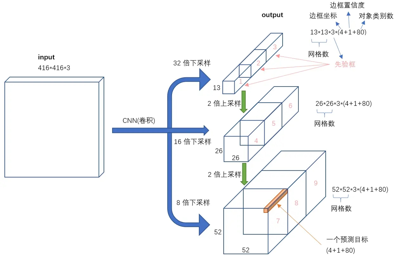 9种尺度的先验框 YOLO3延续了K-means聚类得到先验框的尺寸方法,为每种下采样尺度设定3种先验框,总共聚类出9种尺寸的先验框。在COCO数据集这9个先验框是:(10x13),(16x30),(33x23),(30x61),(62x45),(59x119),(116x90),(156x198),(373x326)。 分配上,在最小的13*13特征图上(有最大的感受野)应用较大的先验框(116x90),(156x198),(373x326),适合检测较大的对象。中等的26*26特征图上(中等感受野)应用中等的先验框(30x61),(62x45),(59x119),适合检测中等大小的对象。较大的52*52特征图上(较小的感受野)应用较小的先验框(10x13),(16x30),(33x23),适合检测较小的对象。
