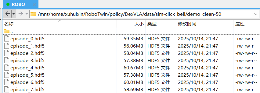 第二个改动是由于文件路径报错(原代码读取的是形如episode_0的文件夹,而/RoboTwin文件夹下的data文件夹中,数据存在)。