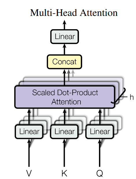 多头注意力机制是将 query、key 和 value 进行 h 次投影,如图: