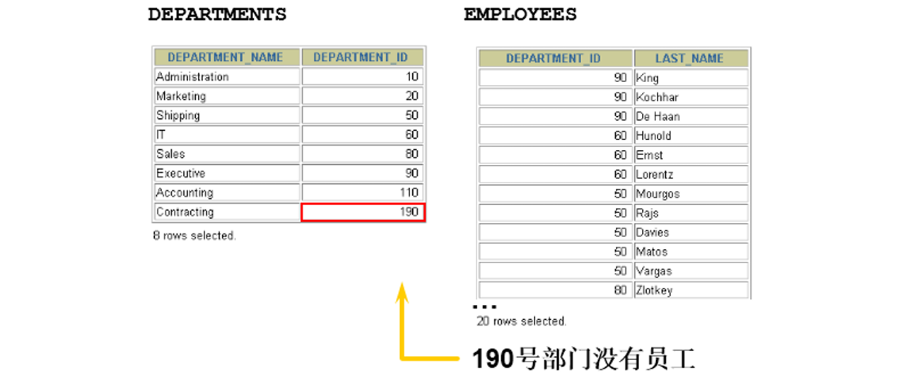 SELECT e.last_name, e.department_id, d.department_nameFROM employees eLEFT OUTER JOIN departments dON (e.department_id = d.department_id) ;