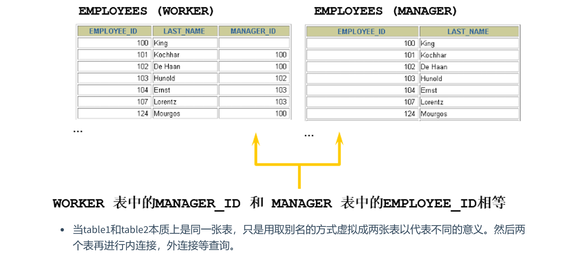 , manager.last_name)FROM employees worker, employees managerWHERE worker.manager_id = manager.employee_id ;
