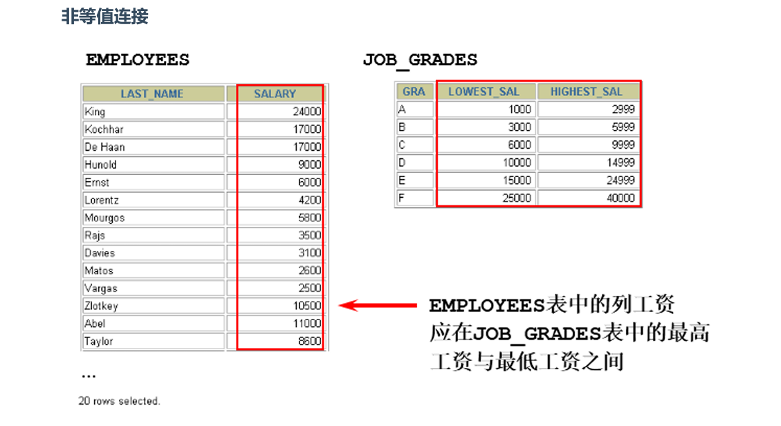 就比如薪资字段,就是再某个具体的薪资范围之内,像这种就称为非等值连接;