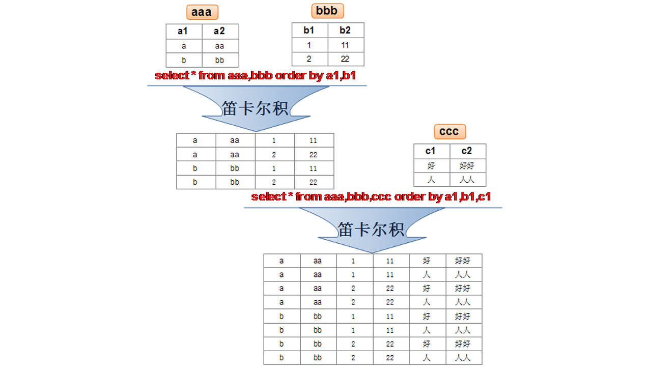 aaa表有两条数据,bbb表有2条数据,那么这两张表笛卡尔积后就有4条数据,再和ccc表的2条数据笛卡尔积之后,就有8条数据,这种现象就是笛卡尔现象。SQL92中,笛卡尔积也称为 交叉连接,英文是 CROSS JOIN 。在 SQL99 中也是使用 CROSS JOIN表示交 叉连接。它的作用就是可以把任意表进行连接,即使这两张表不相关。