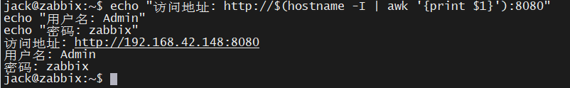 echo "访问地址: http://$(hostname -I | awk '{print $1}'):8080"echo "用户名: Admin"echo "密码: zabbix"