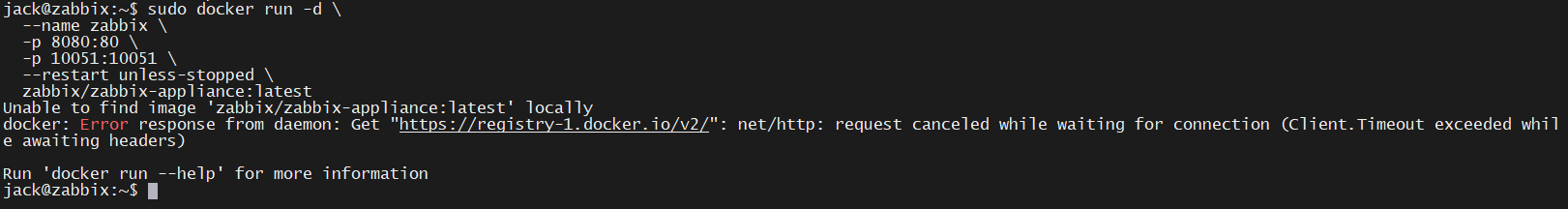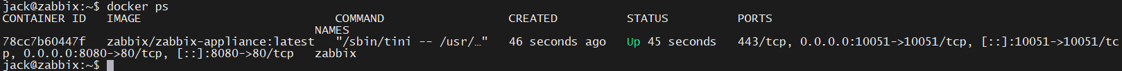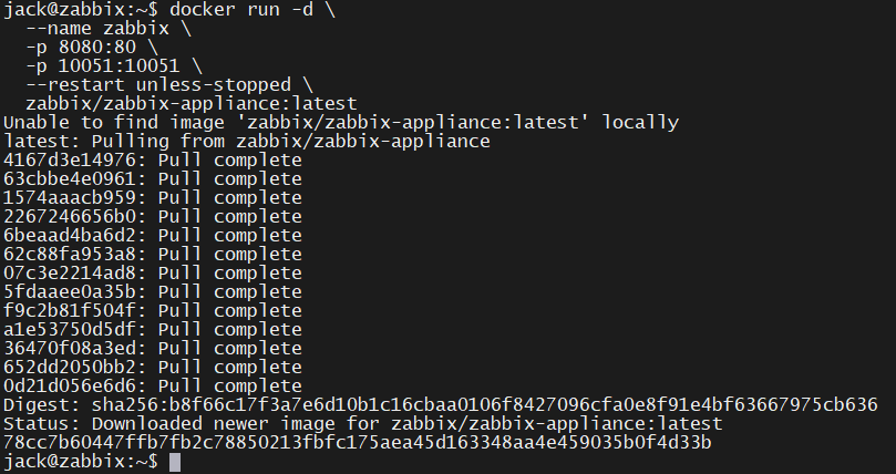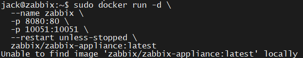 sudo docker run -d \--name zabbix \-p 8080:80 \-p 10051:10051 \--restart unless-stopped \zabbix/zabbix-appliance:latest