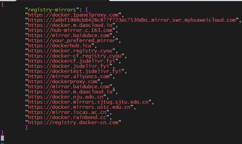 {"registry-mirrors": ["https://docker.1panelproxy.com","https://2a6bf1988cb6428c877f723ec7530dbc.mirror.swr.myhuaweicloud.com","https://docker.m.daocloud.io","https://hub-mirror.c.163.com","https://mirror.baidubce.com","https://your_preferred_mirror","https://dockerhub.icu","https://docker.registry.cyou","https://docker-cf.registry.cyou","https://dockercf.jsdelivr.fyi","https://docker.jsdelivr.fyi","https://dockertest.jsdelivr.fyi","https://mirror.aliyuncs.com","https://dockerproxy.com","https://mirror.baidubce.com","https://docker.m.daocloud.io","https://docker.nju.edu.cn","https://docker.mirrors.sjtug.sjtu.edu.cn","https://docker.mirrors.ustc.edu.cn","https://mirror.iscas.ac.cn","https://docker.rainbond.cc","https://registry.docker-cn.com"]}