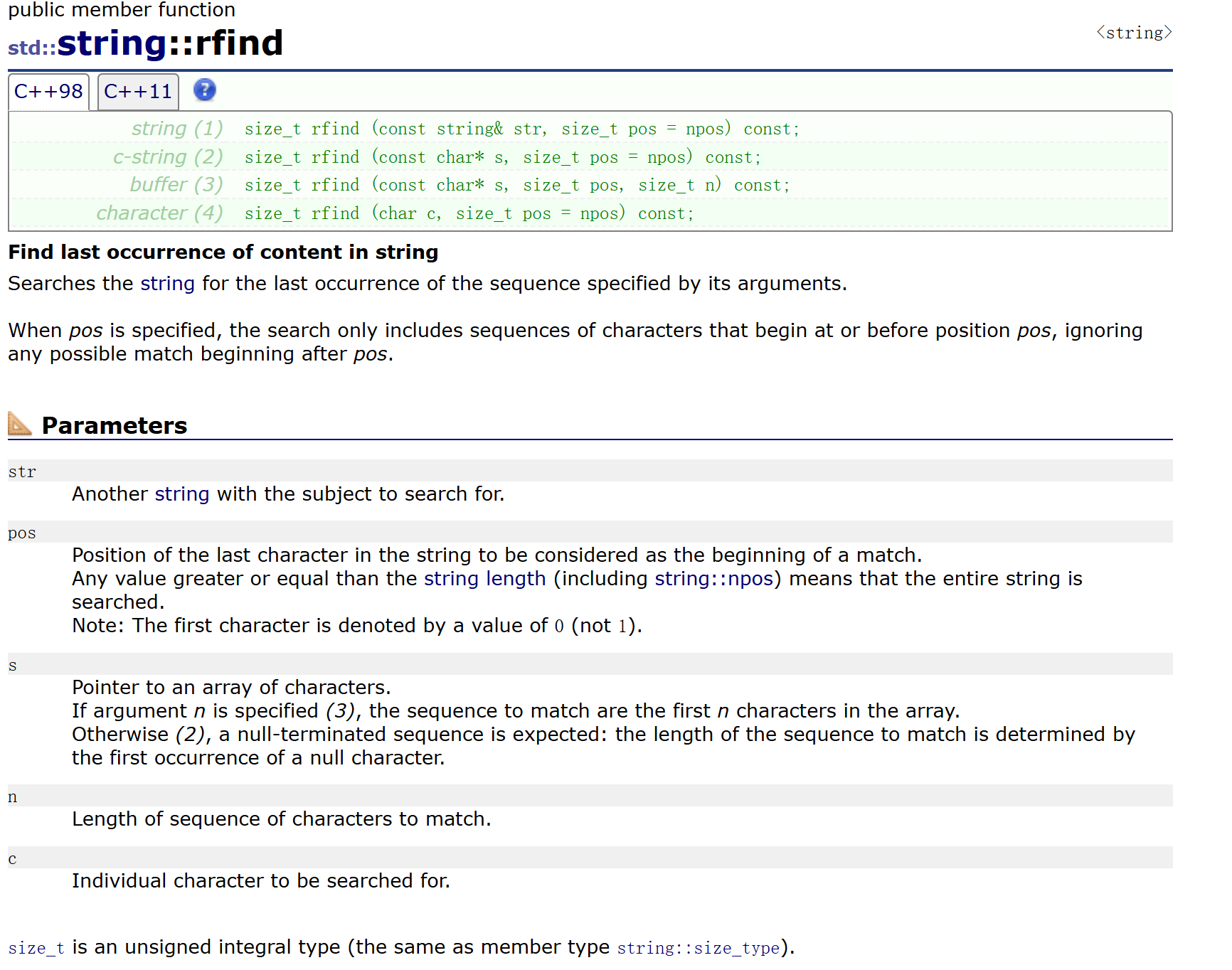 rfind 从字符串pos位置开始往前找字符c,返回该字符在字符串中的位置