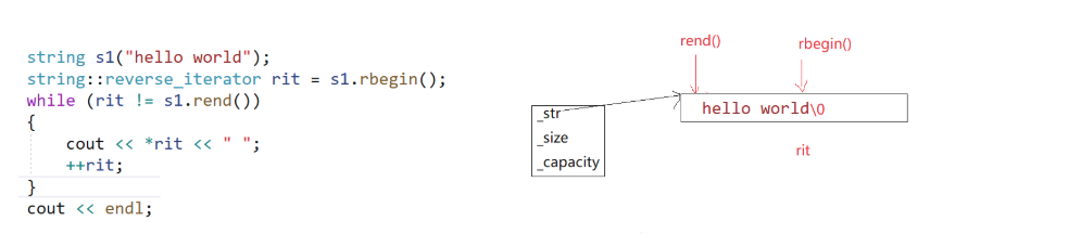 rbegin + rend begin获取一个字符的迭代器 + end获取最后一个字符下一个位置的迭代器(反 向迭代器)