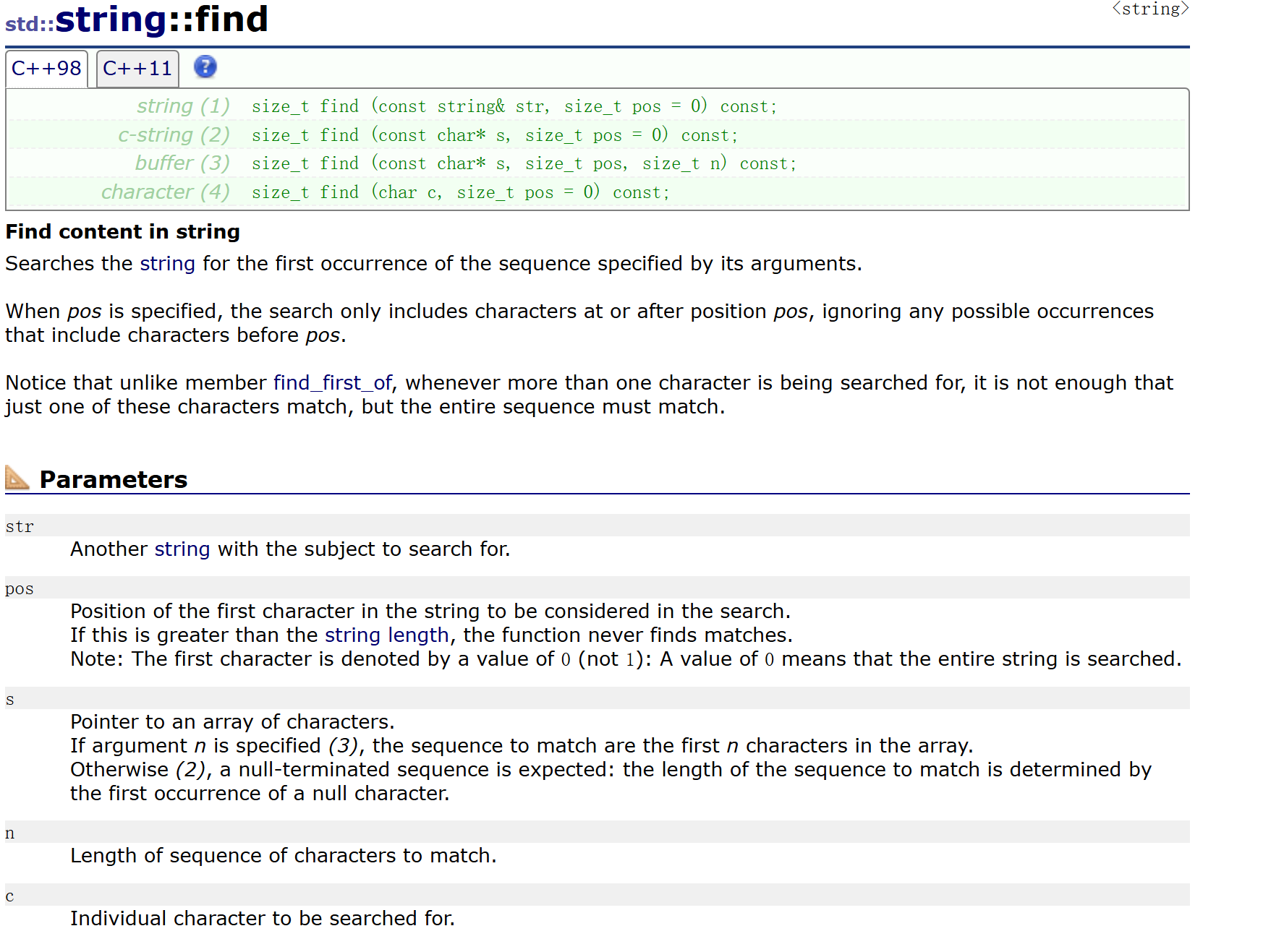 find + npos(常用) 从字符串pos位置开始往后找字符c,返回该字符在字符串中的位置(下标)