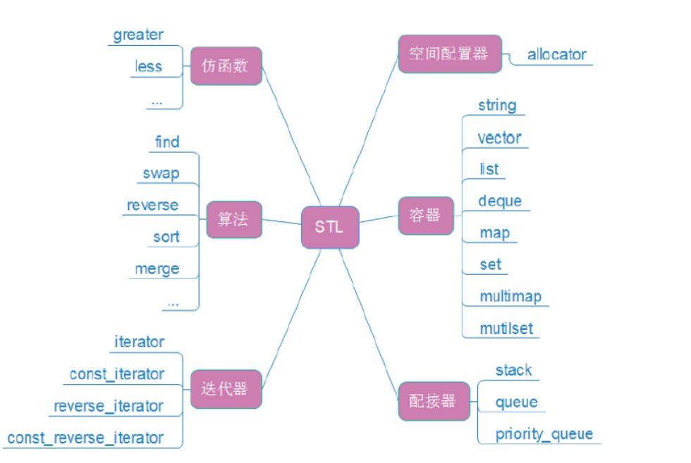 分别是:仿函数、算法、迭代器、配接器、容器、空间配置器