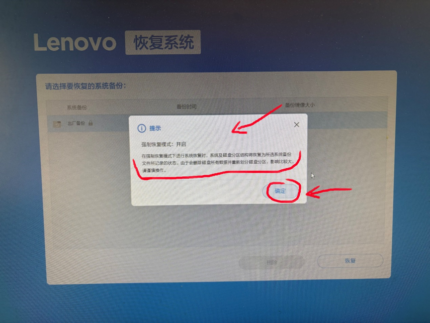 恢复系统界面只有两个选项,一个是备份、一个是恢复,我们用鼠标点击选择【恢复】,如果提示分区被改变无法恢复,可以按Ctrl + F进行强制恢复之类的弹窗,我们点击确定后,直接按键盘上的Ctrl + F按键即可;按完Ctrl + F之后就会弹出如下图中的提示,点击【确定】后就可以直接恢复系统了;