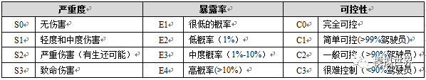 功能故障和驾驶场景的组合叫做危害事件(hazard event)。危害事件确定后,根据下面三个因子——严重度(Severity)、暴露率(Exposure)和可控性(Controllability)评估整个危害事件的风险级别,这也就是说ASIL等级就是由这几个因素综合得到的。下面简单介绍一下这几个概念。