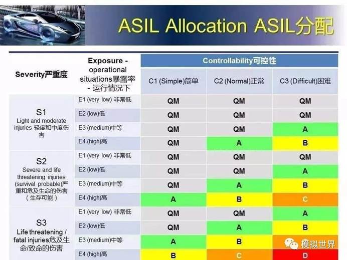 ASIL等级ASIL等级的定义是为了对失效后带来的风险进行评估和量化以达到安全目标,其全称是Automotive Safety Integration Level--汽车安全完整性等级。这个概念来源于IEC61508,其通过失效概率的方式定义了安全完整性等级(SIL)。但是在汽车界只有硬件随机失效可以通过统计数字评估失效概率,软件失效却难以量化,因此ISO26262根据汽车的特点定义了ASIL。