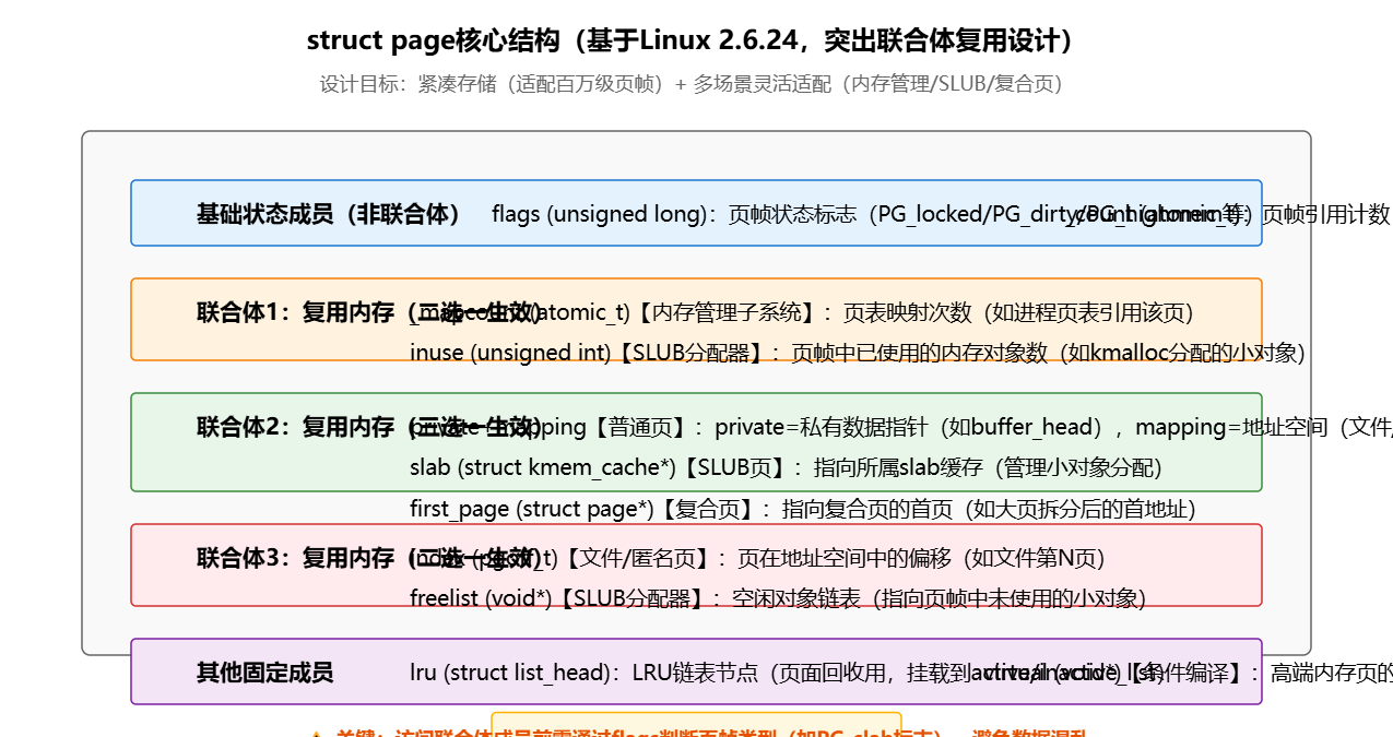 由于不同场景下页帧的用途差异极大(如普通内存页、SLUB分配器页、复合页),内核通过联合体复用内存空间,避免结构冗余:
