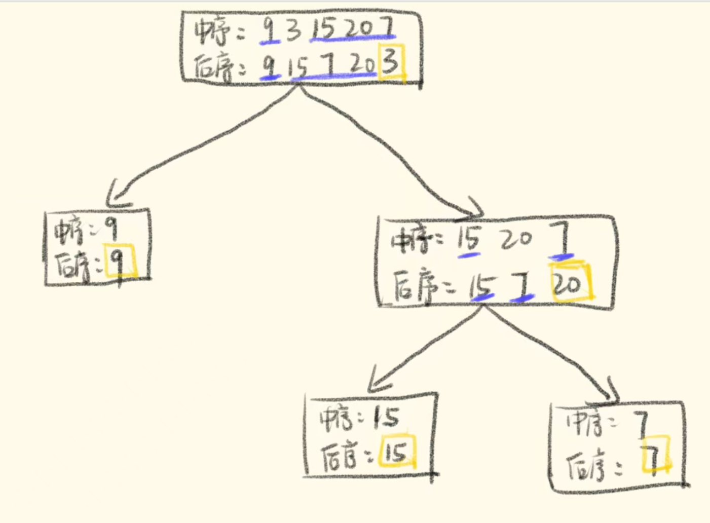 此时,中序数组切成了左中序数组和右中序数组,后序数组切割成左后序数组和右后序数组。