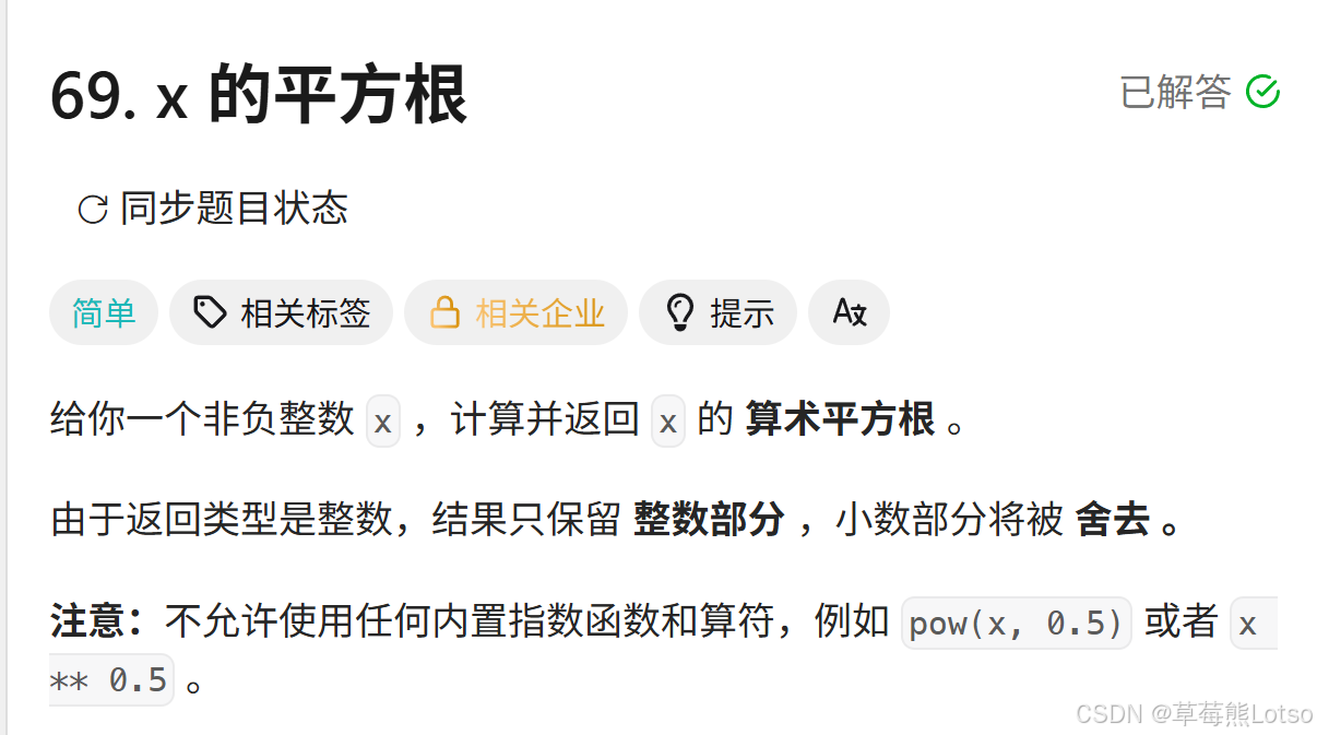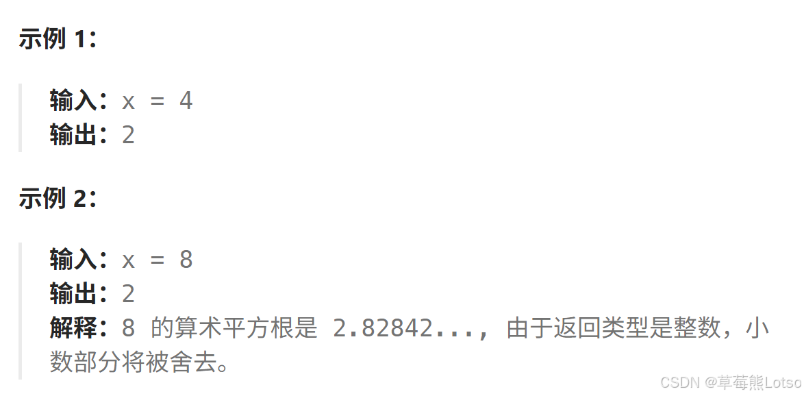 public:int mySqrt(int x) {// 由于两个较⼤的数相乘可能会超过 int 最⼤范围// 因此⽤ long longlong long i = 0;for (i = 0; i <= x; i++) {// 如果两个数相乘正好等于 x,直接返回 iif (i * i == x)return i;// 如果第⼀次出现两个数相乘⼤于 x,说明结果是前⼀个数if (i * i > x)return i - 1;}// 为了处理oj题需要控制所有路径都有返回值return -1;}