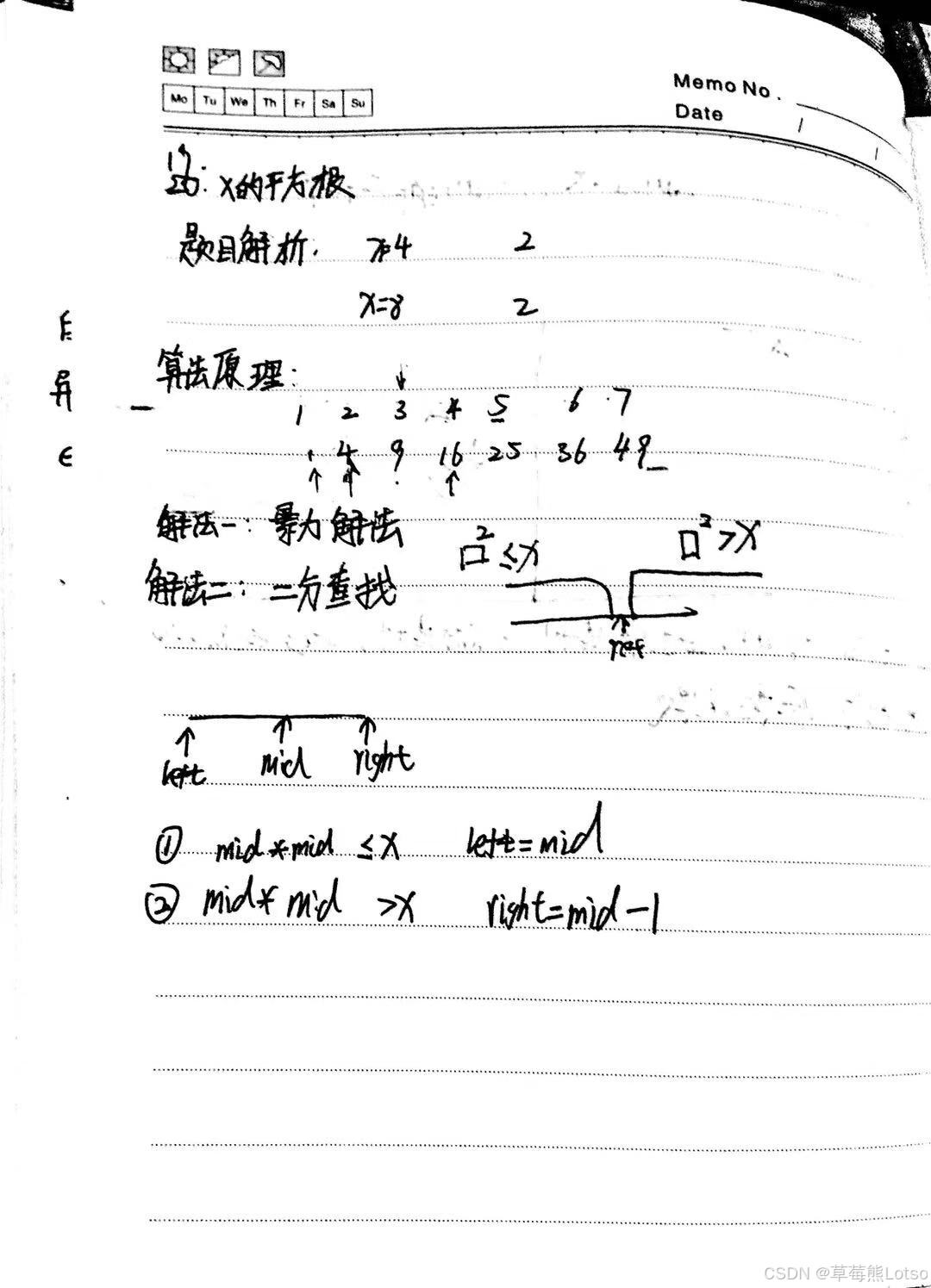 结语:文章详解LeetCode第69题(x的平方根)和第35题(搜索插入位置),通过二分查找算法实现高效解题,提供完整C++代码和手写笔记。内容以实战为导向,帮助读者掌握"最优解"思维,从局部最优到全局最优提升算法能力。