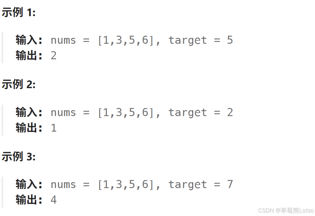public:int searchInsert(vector<int>& nums, int target) {int left=0,right=nums.size()-1;while(left<right){int mid=left+(right-left)/2;if(nums[mid]<target) left=mid+1;else right=mid;}if(nums[left]<target) return left+1;return left;}