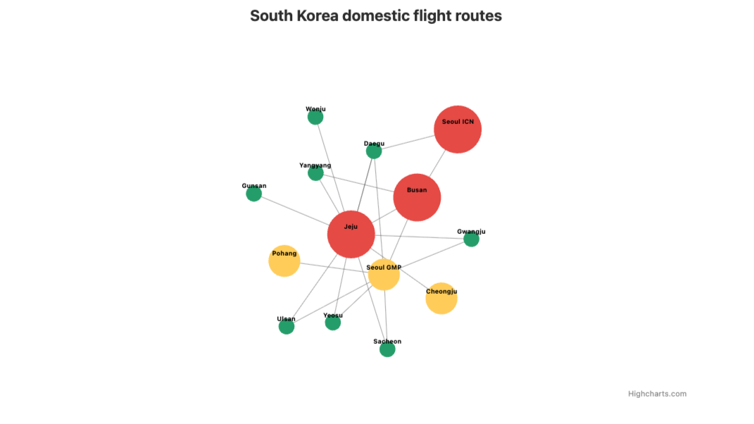 Highcharts 在网络图 (Network Graph) 模块中支持方便地绘制节点与连接线。