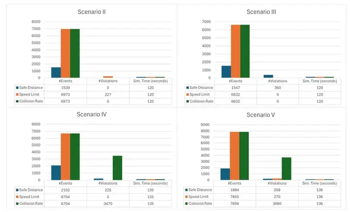 需要注意的是,碰撞率属性的违反次数并非代表碰撞次数。事实上,在场景四和场景五中,均仅发生了一次碰撞。出现这种情况的原因是,在仿真的每个时间步都会对该属性进行检查,因此,在车辆行驶足够距离且未发生碰撞之前,所有相关事件都会被记录为属性违反。