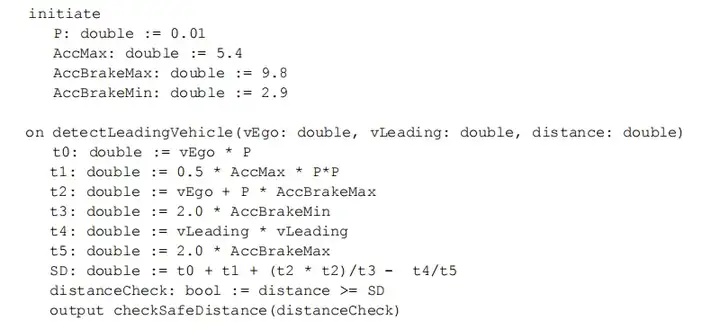 在本节中,我们将探讨自动驾驶汽车(AV)的三项关键安全属性,分别是安全距离(Safe Distance)、道路速度限制(Road Speed Limit)和碰撞率(Collision Rate)。其中,我们将详细阐述安全距离属性,重点介绍用于验证的操作性文件和声明性文件的结构。对于道路速度限制和碰撞率属性,我们将进行简要概述,着重说明它们的重要性以及实施过程中的关键方面,而不深入探讨操作性文件和声明性文件的具体细节。