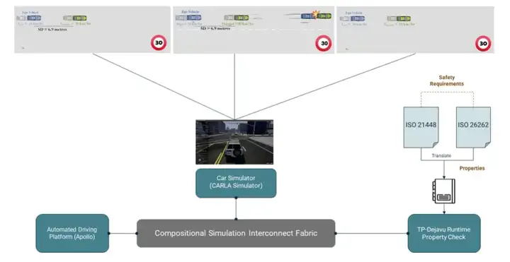 本研究致力于实现一项关键目标,即借助全面的数字孪生仿真开展安全性分析。该数字孪生系统通过组合式仿真互联架构构建而成,能够将自动驾驶平台与汽车场景模拟器以及运行时验证监控器连接起来。我们还确立了一种安全性分析方法,将高层级的国际标准化组织(ISO)要求转化为仿真过程中可验证的属性,从而确保采用主动式方法进行安全性评估。本质上,我们的研究契合了行业在自动驾驶领域对健全安全措施的迫切需求。