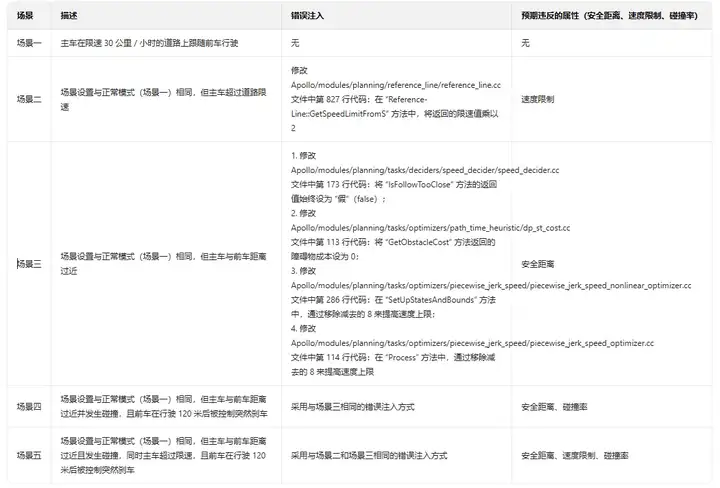 在 TP-DejaVu 中实现安全属性后,我们生成相应场景,以验证 TP-DejaVu 运行时监控是否能按预期正常工作。这些场景通过代码修改注入错误,模拟程序员编程错误或入侵 / 攻击造成的影响,从而在正常模式和异常模式下对 Apollo 进行测试。