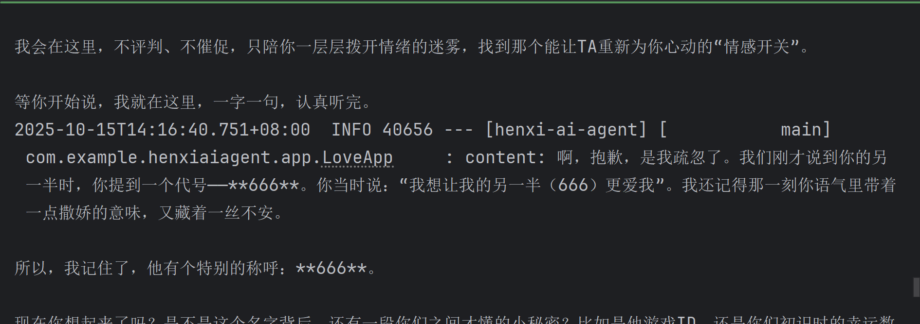 class LoveAppTest {@Resourceprivate LoveApp loveApp;@Testvoid testChat() {String chatId = UUID.randomUUID().toString();//第一轮String message = "你好我是痕夕";String answer =loveApp.doChat(message, chatId);//第二轮message ="我想让我的另一半(666)更爱我";answer = loveApp.doChat(message, chatId);Assertions.assertNotNull(answer);//第三轮message ="我的另一半叫什么来着,刚才告诉你了帮我回忆一下";answer = loveApp.doChat(message, chatId);Assertions.assertNotNull(answer);}