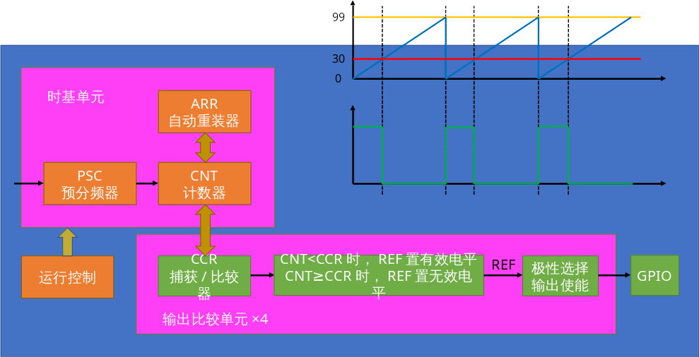 产生PWM;输出比较可以通过比较CNT与CCR捕获比较寄存器值的关系,来对输出电平进行置1、置0或翻转的操作,用于输出一定频率和占空比的PWM波形;每个高级定时器和通用定时器都拥有4个输出比较通道高级定时器的前3个通道额外拥有死区生成和互补输出的功能;高级定时器的前3个通道额外拥有死区生成和互补输出的功能