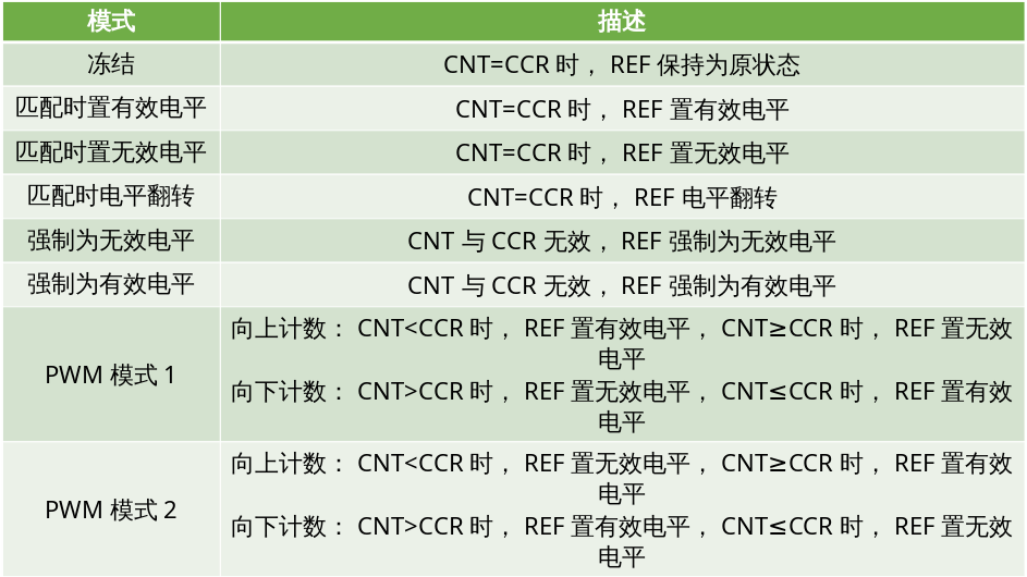 冻结模式:CNT和CCR没有用,处于无效状态,REF保持为原状态,这都是一样的效果。这个模式也比较简单,它根部不管CNT和CCR谁大谁小,直接REF保持不变,维持上一个状态就可以了。用处:比如正在输出PWM波、突然想暂停一会儿输出、就可以设置成这个模式。一旦切换为冻结模式后,输出就暂停了。并且高低电平也维持为暂停时刻的状态,保持不变,这就是冻结模式的作用。