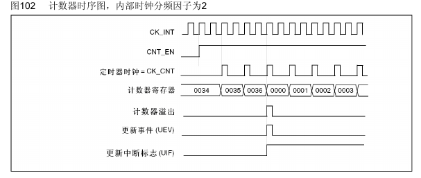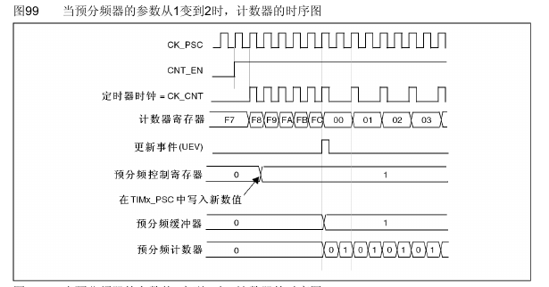 解读3:在计数周期中改变分频系数,不会立刻改变,会等待到更新事件发生,下一个计数周期才会写入预分频缓冲器,进行分频。