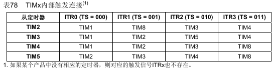TRGI触发连接(可以用于触发从模式,这里仅做外部时钟):当用TRGI作为外部时钟时为外部时钟模式1。ETR走ETRF和TRGI对于做外部时钟来说是一样的。ITRx是来自别的定时器的TRGO,实现定时器级联。