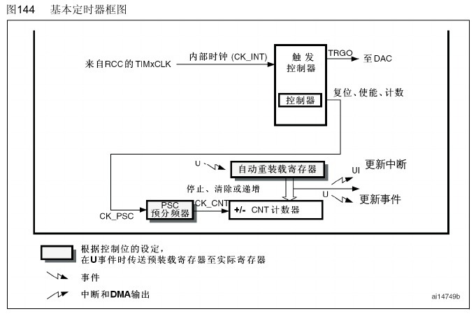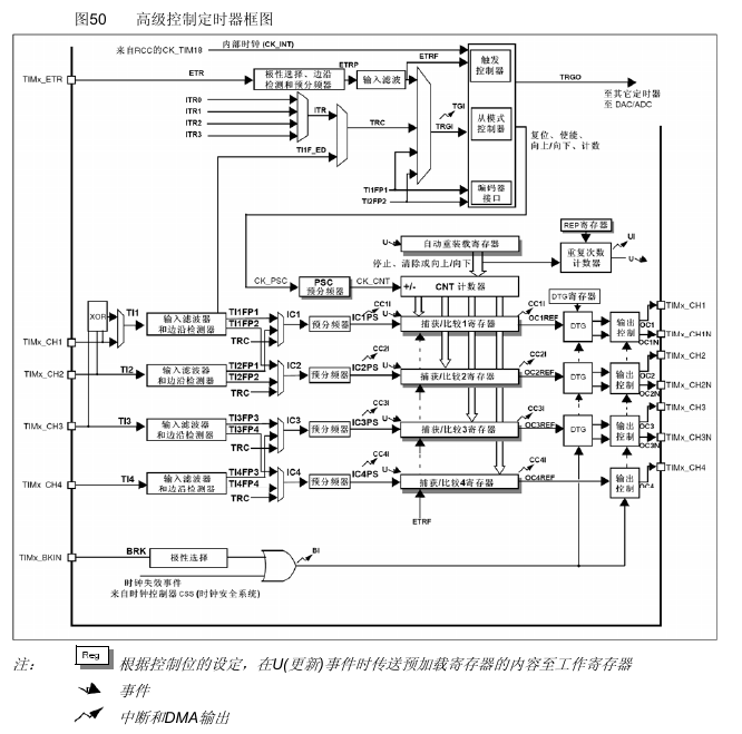 注:下方所有定时器中,黑色框框下有阴影的寄存器都是有缓冲寄存器的,可以配置是否使用。如PSC预分频器,自动重装载寄存器