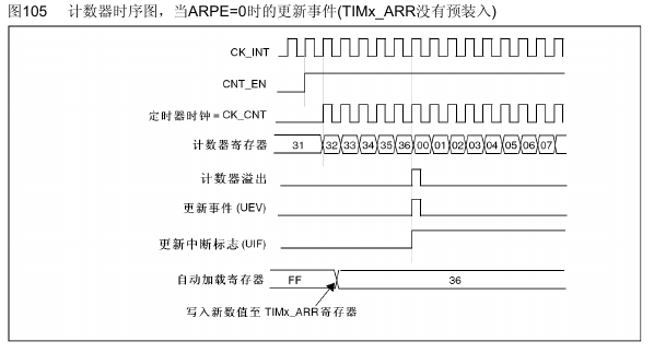 解读2:如果计数器已经到F1了,这个时候自动加载寄存器从FF改成36,那么计数器将一直加到FFFF,然后溢出从0开始加到36才产生更新中断和事件。