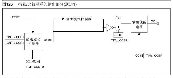 在这个图里,左边就是CNT计数器和CCR1第一路的捕获/比较寄存器。 它两进行比较,当CNT>CCR1或者CNT=CCR1时,就会给输出模式控制器传一个信号,然后输出模式控制器就会改变它输出OC1REF的高低电平。REF信号实际上就是指信号的高低电平,这个REF是reference的缩写,意思是参考信号。上面还有一个ETRF输入,这个是定时器的一个小功能,一般不用。接着REF信号可以前往主模式控制器,可以把这个REF信号映射到主模式的TRGO输出上去,不过REF的主要去向还是下面这一路,通过这一路到达TIMx_CCER,给这个寄存器写0,信号就会往上走,就是信号电平不翻转,进来啥样,出去啥样;写1的话,信号会往下走,就是信号通过一个非门取反,那输出的信号就是输入信号高低电平反转的信号;这就是极性选择,就是选择是不是要把高低电平反转一下。接着就是输出使能电路了,选择要不要输出,这个引脚就是CH1通道的引脚,最后就是OC1引脚,这个引脚就是CH1通道的引脚,在引脚定义表里就可以直到具体是哪个GPIO口了。