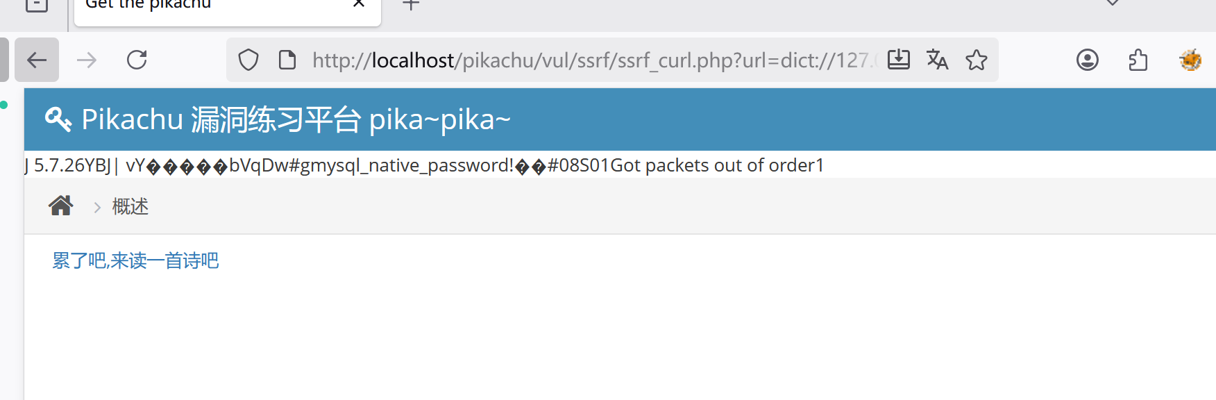 ),就证明 3306 端口存活且运行 MySQL;整个过程不需要出网、不需要暴力扫描,只靠服务器自己发出的那条“字典协议”请求完成端口嗅探。表明-----dict 协议虽被设计成“在线字典”,但在 SSRF 场景下可瞬间变成内网端口扫描器;服务器对 URL 协议未做白名单过滤,任意协议+任意端口都能直连;回显差异(正常报错 vs 协议乱码)足以判断服务存活,无需回显真实内容即可推断开放端口,为后续转 gopher 打 Redis/MySQL 提供精确目标。