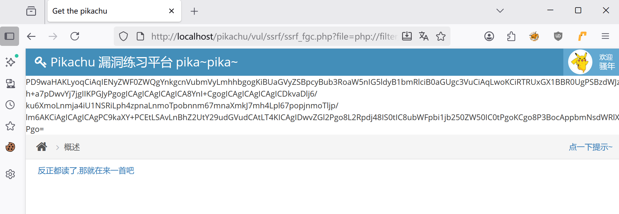 http://localhost/pikachu/vul/ssrf/ssrf_fgc.php?file=php://filter/read=convert.base64-encode/resource=ssrf.php