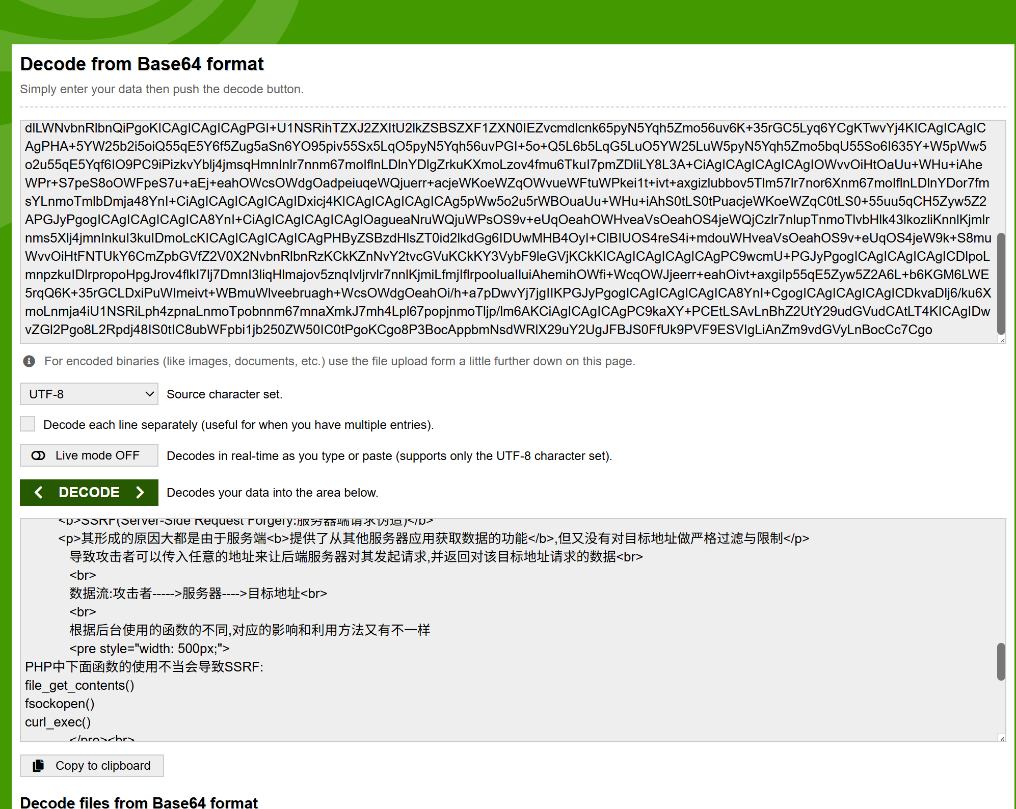 ile_get_contents 支持 PHP 内置封装器 php://filter,把 resource 指向当前目录下的 ssrf.php 并用 base64 编码输出,即可绕过“直接显示 PHP 源码被解析”的问题;浏览器得到的将是整段 base64 字符串,解码后即可还原成明文源码,完成任意文件(含 PHP 自身)读取,无需知道绝对路径也无需 file:// 协议。