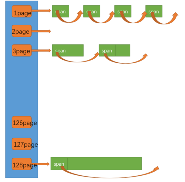 central cache和page cache的核心结构都是spanlist的哈希桶,但是它们是有本质区别的,central cache哈希桶,是跟thread cache一样的大小对齐关系映射的,他的spanlist中挂的span中的内存都被按映射关系切好链接成小块内存的自由链表。而page cache中的spanlist则是按下标桶号映射的,也就是说第i号桶中挂的span都是i页内存