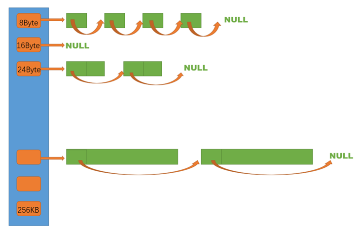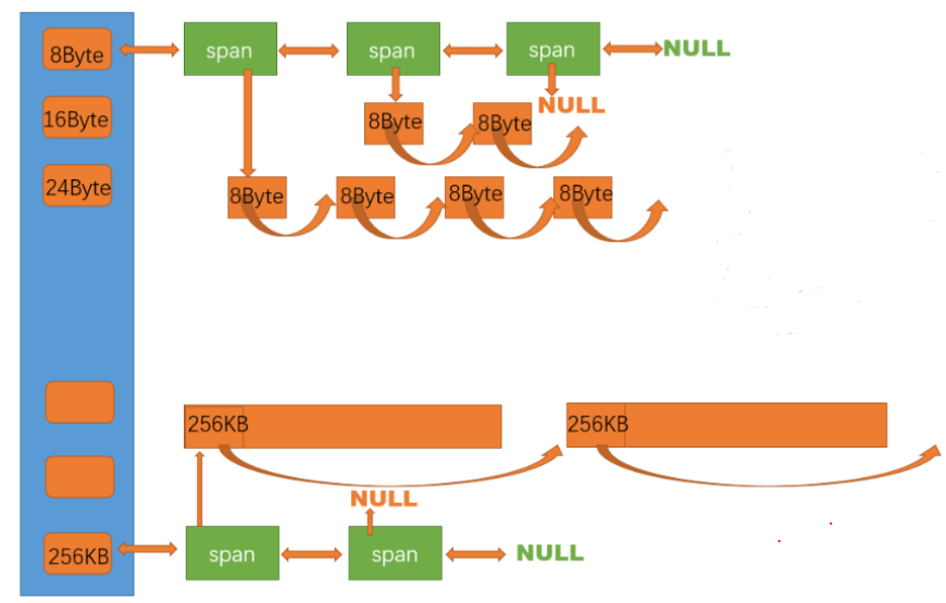 public:// 整体控制在最多10%左右的内碎片浪费// [1,128] 8byte对齐 freelist[0,16)// [128+1,1024] 16byte对齐 freelist[16,72)// [1024+1,8*1024] 128byte对齐 freelist[72,128)// [8*1024+1,64*1024] 1024byte对齐 freelist[128,184)// [64*1024+1,256*1024] 8*1024byte对齐 freelist[184,208)static inline size_t _RoundUp(size_t bytes, size_t AlignNum){return (bytes + AlignNum - 1) & ~(AlignNum - 1);}static inline size_t RoundUp(size_t bytes){if (bytes <= 128){return _RoundUp(bytes, 8);}else if (bytes <= 1024){return _RoundUp(bytes, 16);}else if (bytes <= 8 * 1024){return _RoundUp(bytes, 128);}else if (bytes <= 64 * 1024){return _RoundUp(bytes, 1024);}else if (bytes <= 256 * 1024){return _RoundUp(bytes, 8 * 1024);}else{assert(false);return -1;}}static inline size_t _Index(size_t bytes, size_t align_shift){return ((bytes + (1 << align_shift) - 1) >> align_shift) - 1;}static inline size_t Index(size_t bytes){assert(bytes <= MAX_BYTES);static int group_array[4] = { 16, 56, 56, 56 };if (bytes <= 128){return _Index(bytes, 3);}else if (bytes <= 1024){return _Index(bytes - 128, 4) + group_array[0];}else if (bytes <= 8 * 1024){return _Index(bytes - 1024, 7) + group_array[0] + group_array[1];}else if (bytes <= 64 * 1024){return _Index(bytes - 8 * 1024,10) + group_array[0] + group_array[1] + group_array[2];}else if (bytes <= 256 * 1024){return _Index(bytes - 64 * 1024, 13) + group_array[0] + group_array[1] + group_array[2] + group_array[3];}else{assert(false);}return -1;}static size_t NumMoveSize(size_t size){assert(size > 0);int num = MAX_BYTES / size;if (num < 2) num = 2;if (num > 512)num = 512;return num;}};struct Span