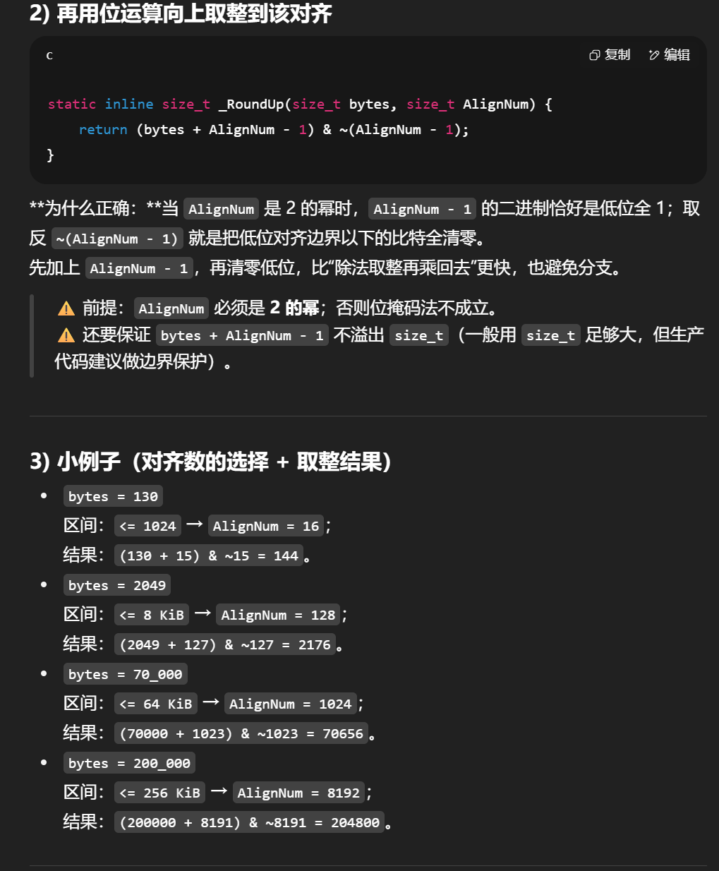 public:// 整体控制在最多10%左右的内碎片浪费// [1,128] 8byte对齐 freelist[0,16)// [128+1,1024] 16byte对齐 freelist[16,72)// [1024+1,8*1024] 128byte对齐 freelist[72,128)// [8*1024+1,64*1024] 1024byte对齐 freelist[128,184)// [64*1024+1,256*1024] 8*1024byte对齐 freelist[184,208)static inline size_t _RoundUp(size_t bytes, size_t AlignNum){return (bytes + AlignNum - 1) & ~(AlignNum - 1);}static inline size_t RoundUp(size_t bytes){if (bytes <= 128){return _RoundUp(bytes, 8);}else if (bytes <= 1024){return _RoundUp(bytes, 16);}else if (bytes <= 8 * 1024){return _RoundUp(bytes, 128);}else if (bytes <= 64 * 1024){return _RoundUp(bytes, 1024);}else if (bytes <= 256 * 1024){return _RoundUp(bytes, 8 * 1024);}else{assert(false);return -1;}}static inline size_t _Index(size_t bytes, size_t align_shift){return ((bytes + (1 << align_shift) - 1) >> align_shift) - 1;}static inline size_t Index(size_t bytes){assert(bytes <= MAX_BYTES);static int group_array[4] = { 16, 56, 56, 56 };if (bytes <= 128){return _Index(bytes, 3);}else if (bytes <= 1024){return _Index(bytes - 128, 4) + group_array[0];}else if (bytes <= 8 * 1024){return _Index(bytes - 1024, 7) + group_array[0] + group_array[1];}else if (bytes <= 64 * 1024){return _Index(bytes - 8 * 1024,10) + group_array[0] + group_array[1] + group_array[2];}else if (bytes <= 256 * 1024){return _Index(bytes - 64 * 1024, 13) + group_array[0] + group_array[1] + group_array[2] + group_array[3];}else{assert(false);}return -1;}