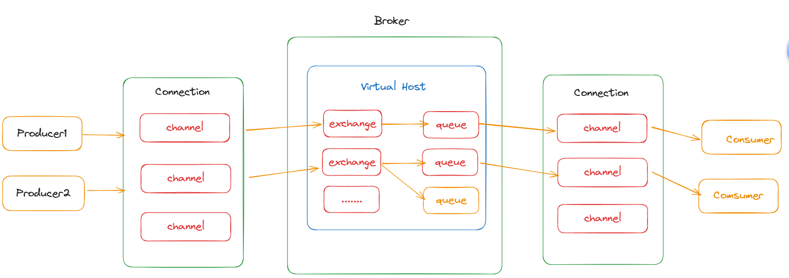 Virtual host:虚拟主机,这是一个虚拟的概念,他为消息队列提供了一种逻辑上的隔离,对于RabbitMQ而言,一个BrokerServer上可以存在多个Virtual host,当多个不同用户使用同一个RabbitMQ Server提供服务时,可以虚拟划分出多个vhost,每个用户在自己的Virtual host中创建exchange/queue等。