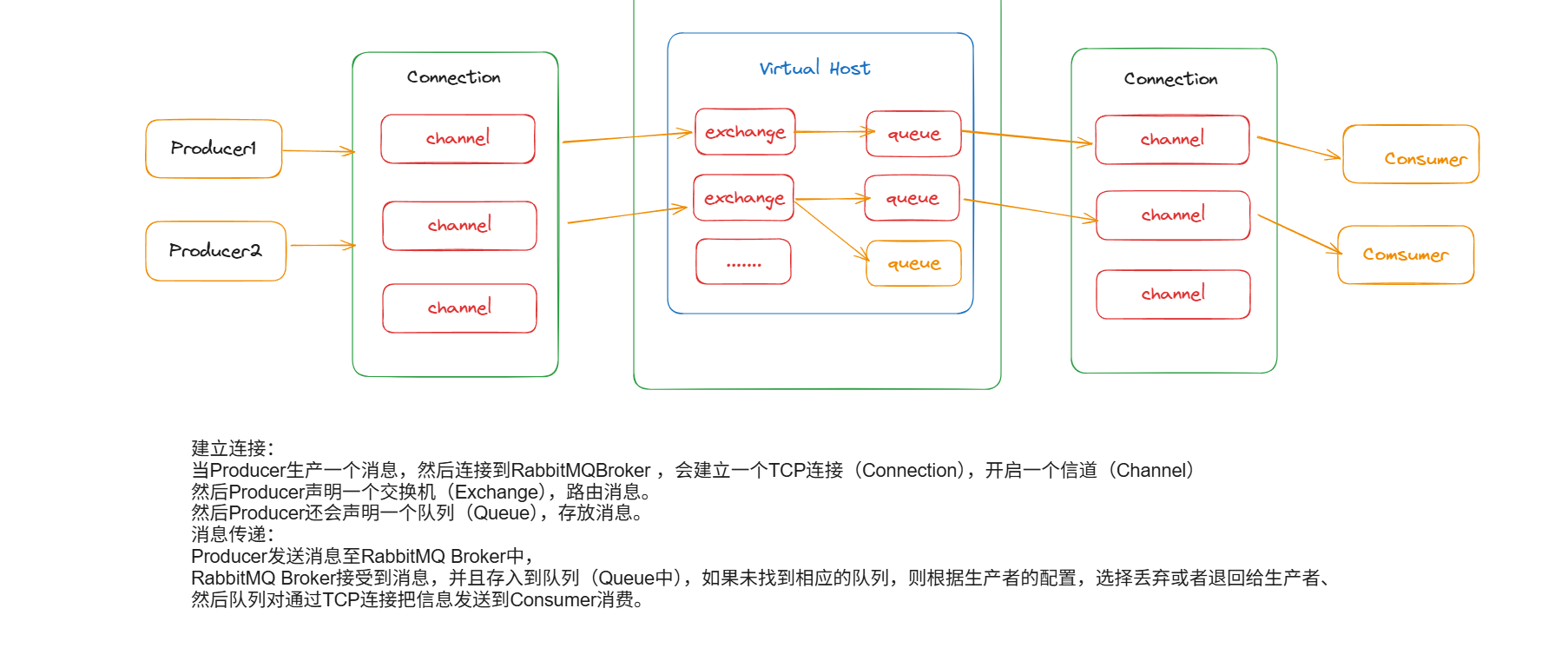Channel:通道,信道,Channel是在Connection之上的一个抽象层,在RabbitMQ中,一个TCP连接有多个Channel,每个Channel都是独立的的虚拟链接,消息的发送和接收都是基于Channel的。