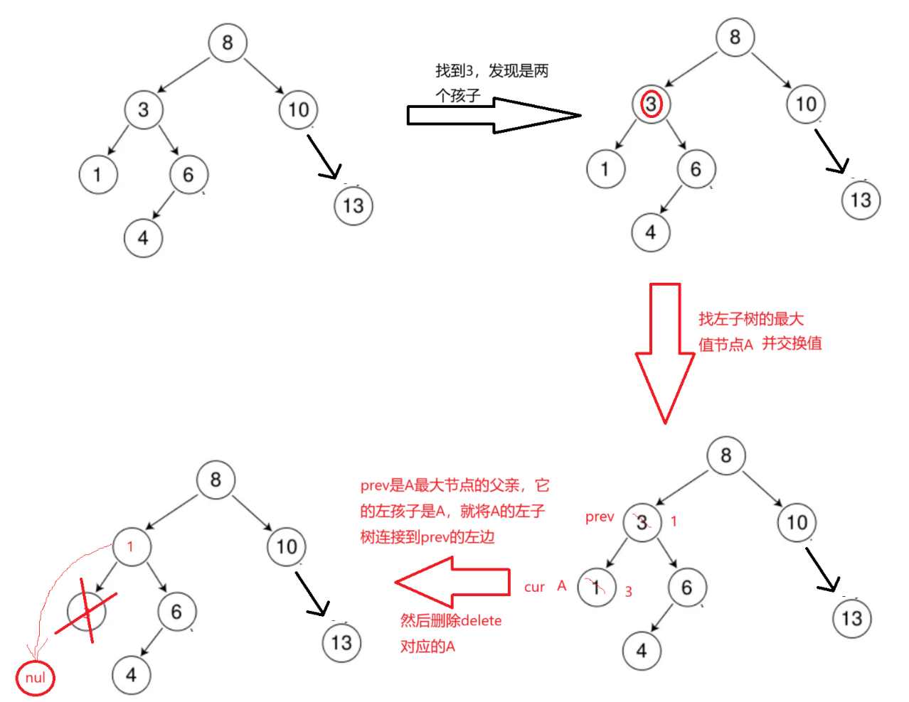 2.有两个孩子的情况:找被删除节点的左子树的最大节点A,然后将它的值和被删除节点交换,然后需要处理被删除节点。如果A节点是A的父节点的右子树,A的左边的子树链接到A的父节点的右边,如果A节点是A的父节点的左子树,A的左边的子树链接到A父节点的左边。(这里主要是因为A节点是不可能还有右子树了的)