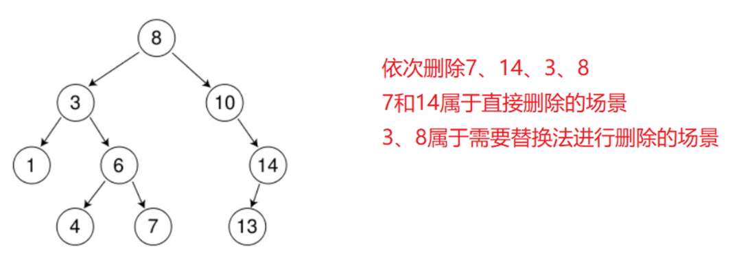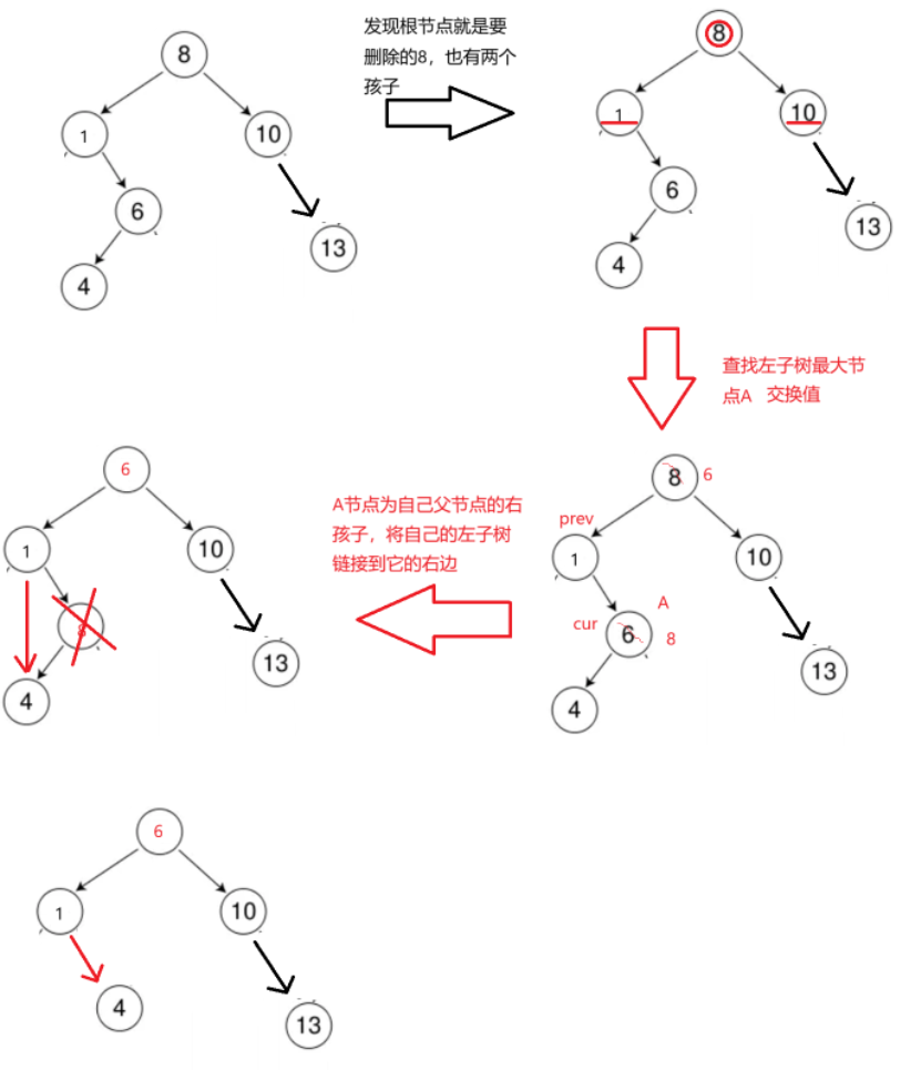 主要是我们完成前面画图的交换值后,其实对于要删除的节点的左子树再进行一个递归删除刚好附用了前面的代码,直接就解决了问题。刚好就删除了对方。