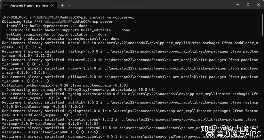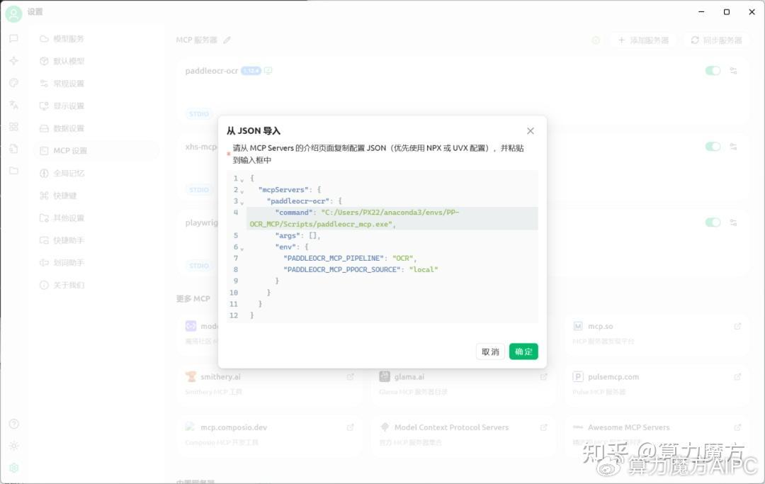 {"mcpServers": {"paddleocr-ocr": {"command": "请注意,如果你使用的是Anaconda,请在Anaconda安装的隔离环境中输入where paddleocr_mcp来获取对应的MCP路径。否则无法使用",